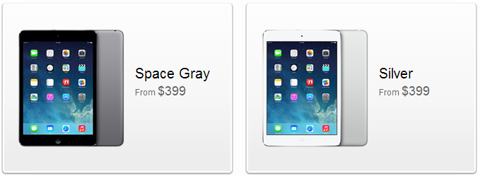 The iPad Mini Retina, or iPad Mini 2 as many people are labelling it comes in two color choices: Space Grey and Silver. The starting price for one of these is $399 which will get you the 16GB Wi-Fi only model, however if you want to add Cellular then you are looking at a basic price of $529.
